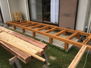 そのデッキ部分の束柱と土台組の様子です。木材部分は防腐剤のキシラデコールという塗材を塗っています。