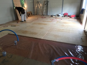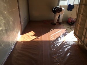 まずは防湿シートを床面に張っていきます。床版の中には100ミリの断熱材が入れてあります。