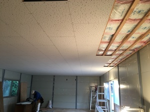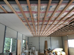 この画像は、野縁下地組が完了した後、断熱材を充填してジプトーンを張っている様子です。