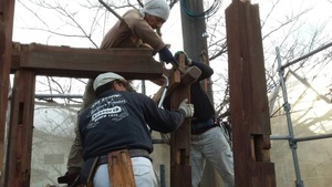一つの継手を外すのに大工さん3人がかりで掛矢や大バールやあて木などを使って