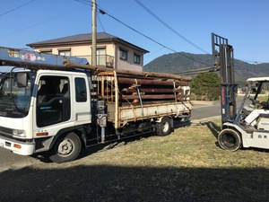 この画像は、2階の小屋組の材木を宗像に4トンユニックを使って運んで帰って来た直後の写真です。
