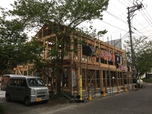 この画像は、西側の門前町通り側から撮った屋根終いの様子ですが高さが高いのであまりわかりませんねぇ~(^^)