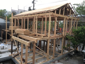 次のブログでは化粧垂木と化粧野地板を張っている様子をアップしたいと思います。