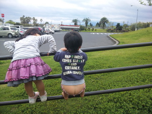 その帰り道パーキングエリアで昼食を食べた後、子供達とちょっと遊んでいる途中、最近オムツが取れたばかりの2歳の長男坊!