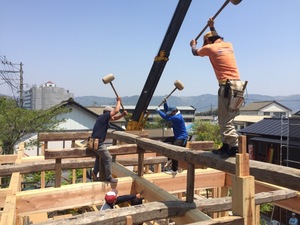 アップしているのですが大工さんが大きなカケヤで叩いて打ち込んでいる様子をアップしたいと思います(^^)