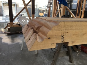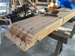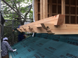 この画像は、3人で彫った彫刻で飾った持ち出し梁を所定の位置に納めた様子の写真です。