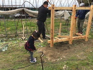 この画像は、鯉のぼりの櫓を組んでいる様子の写真です。