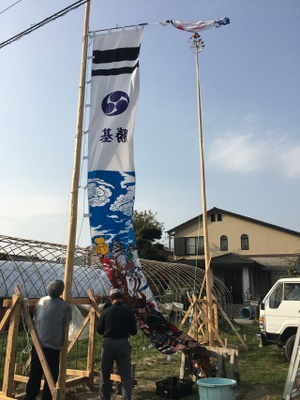 写真に写っている約10M以上ある2本の竿にのぼり旗と鯉のぼりを揚げる為建てたいと思います。