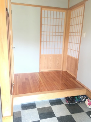 正面の片引き戸を開けると座敷へ右側の片引き戸を開けるとリビングへとなります。