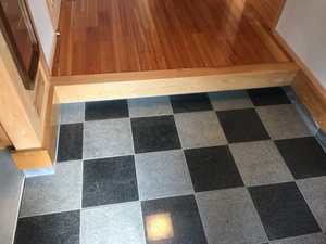 この画像は、玄関ホールの写真です。床のフローリングは今は高価になった松の無垢のフローリングです。