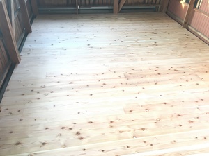 この画像は、2階の床に杉の無垢フローリングを重ね張りした様子の写真です。