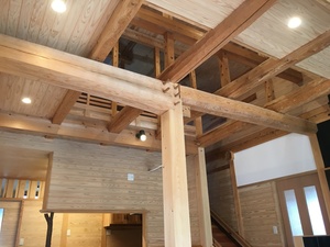 大黒柱に敷き梁を2本差して(もちろん釘やボルトは使いません)