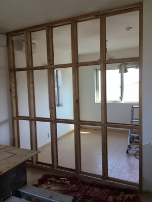 様子の写真です。上下にも間柱と同じ寸法の下地枠を組んでいます。