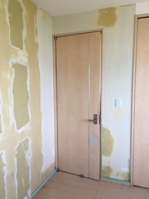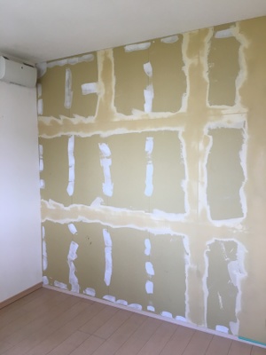 この画像は、ワンちゃんが引っかいてクロスも剥がれボードに穴が開いていたので今回パテ処理して