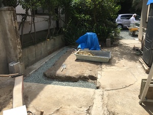 基礎ブロックが積まれる場所に床掘してクラッシャーランという砂利を敷き込んでいる