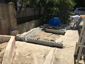 この画像は、クラッシャーランを敷き込んだ後基礎ブロックを積いている様子の写真です。