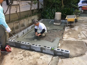この画像は、基礎ブロックと土間モルタル塗りが完了した様子の写真です。