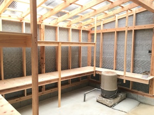 この画像は、倉庫内部の完成の様子ですがお手製の物干しと大収納スペースの棚を
