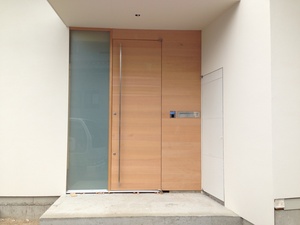 ようやく玄関のFIXガラスが入りました。なかなか栂(トガ)の柾目の板とマッチしていい玄関になりました。