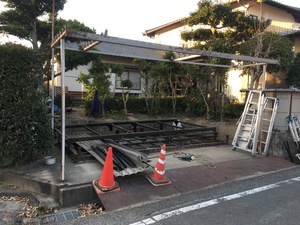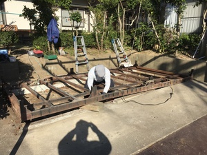 この画像は、屋根の骨組みをサンダーで切断して降ろした様子です。残るは下屋部分と床の骨組みです。