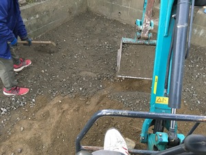 コンクリート廃材の場外搬出が終わるとクラッシャーランという砕石を敷いて敷きならして