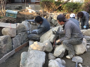 1番下の石積みなので現場で練った生コンを打ちながら石積みを決めていきます。