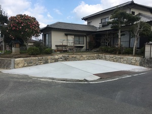 では今日も駐車場の宝満岩の石積みと土間コンクリート工事が完了した後 玄関から駐車場まで竹垣の