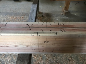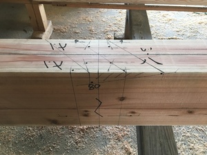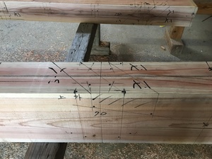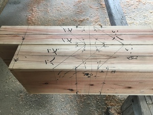 八番通りの桁に妻桁と鼻木をアリ掛けする為の墨付けが完了しました。