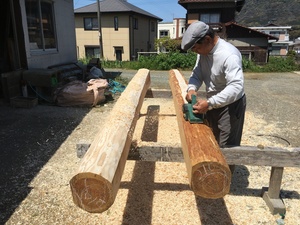 まず太鼓梁を搬入したら墨付けする前に皮を剥いだ状態の太鼓梁に薄皮が残っているので