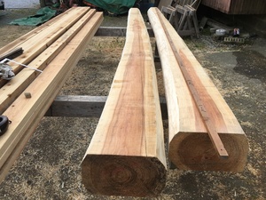 この間、加工した4mの太鼓梁2本に墨を付けていきます。