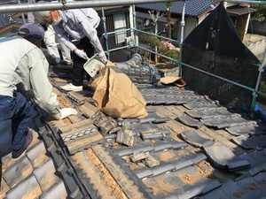 いよいよ瓦屋さんと一緒に既存の屋根瓦を解体して剥いでいる様子です。