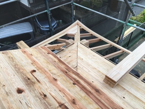 化粧垂木と野地板が張り終わったら広小舞と隅木廻りの反り増しを取り付けた様子です。