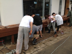 昨日は、朝から雨の中、お施主様とその仕事仲間と設計士さん達とデッキ造りをしました。