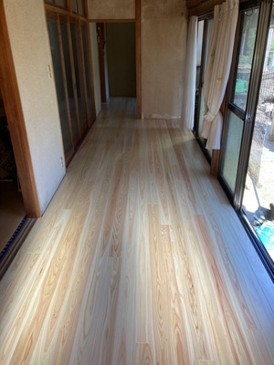 玄関ホールから廊下の桧無垢フローリング重ね張り完了です。