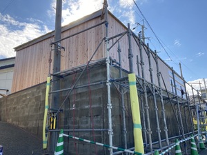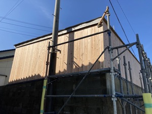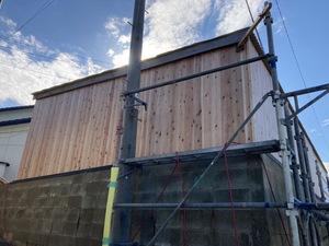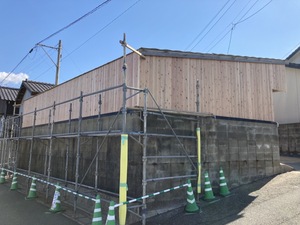 外壁仕上げ材の杉板が張り終わりました(^^)