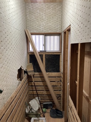 写真手前の壁を片引き戸枠寸法で解体してトイレ入口の場所と便器の向きを