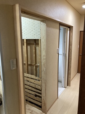 ちょっと分かり難いですが廊下側から新しく入口を作って洗面脱衣室の入口と連結させて
