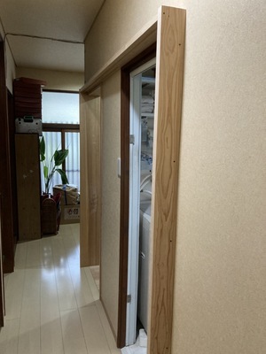 洗面脱衣室入口側から新しく洗面脱衣室入口、トイレ入口の連結変則化粧枠の様子です。