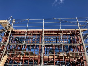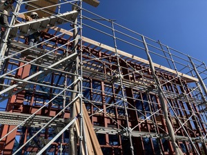 この現場の作業内容は、鉄骨造の建物に木造で屋根を架けるという作業です。