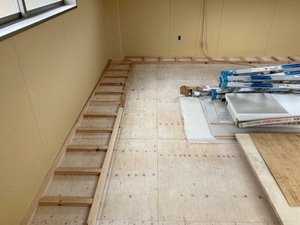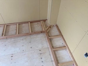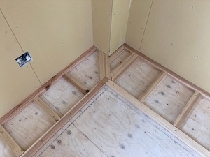 角度を変えて撮った根太下地の様子です。このうえに構造用合板を張っていきます。