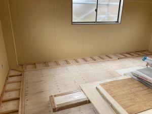 この間のブログでアップした2階の床組みして大引きの上に構造用合板を張って畳仕上げになるのですが、