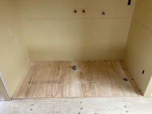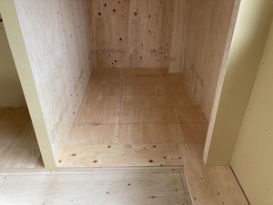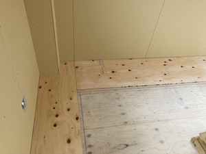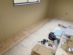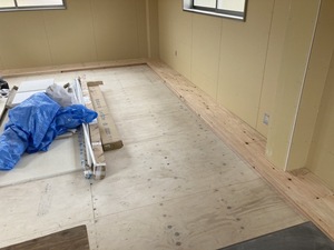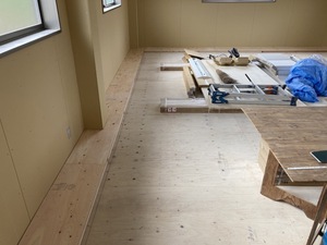2階の廻縁の根太下地組の上に構造用合板を下地張りした様子です。