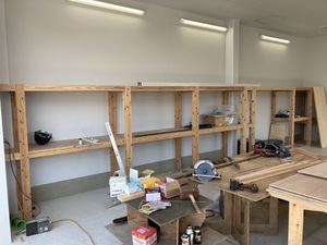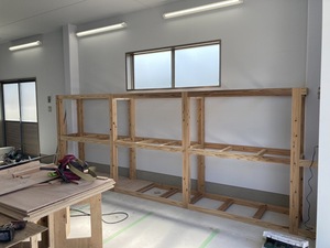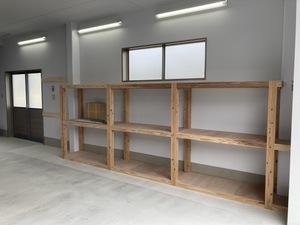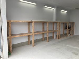 1階の消防格納庫の左右の壁に造り付けの棚が出来上がりました。