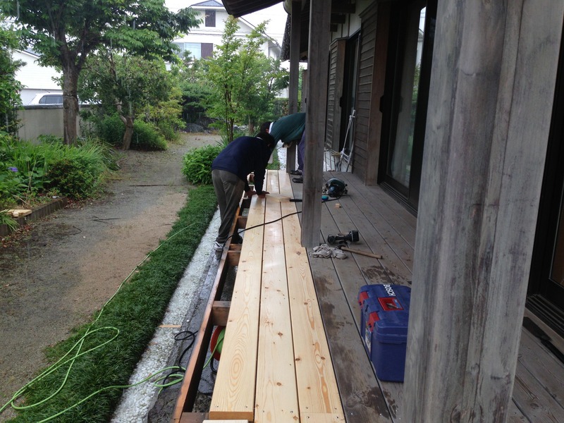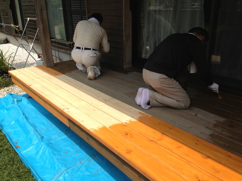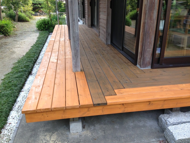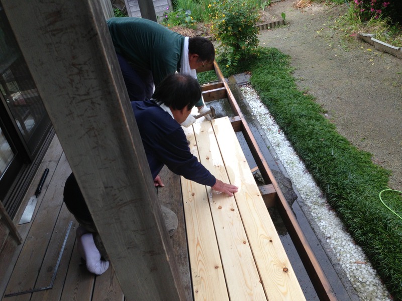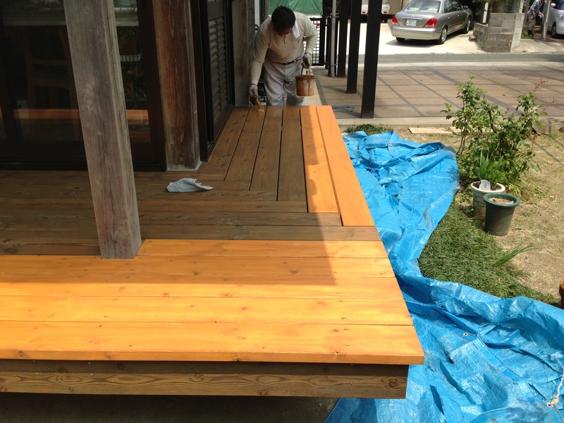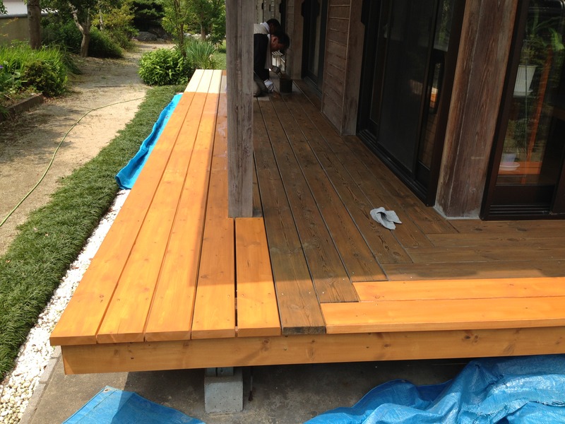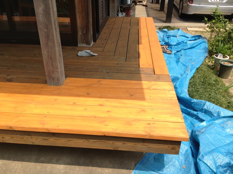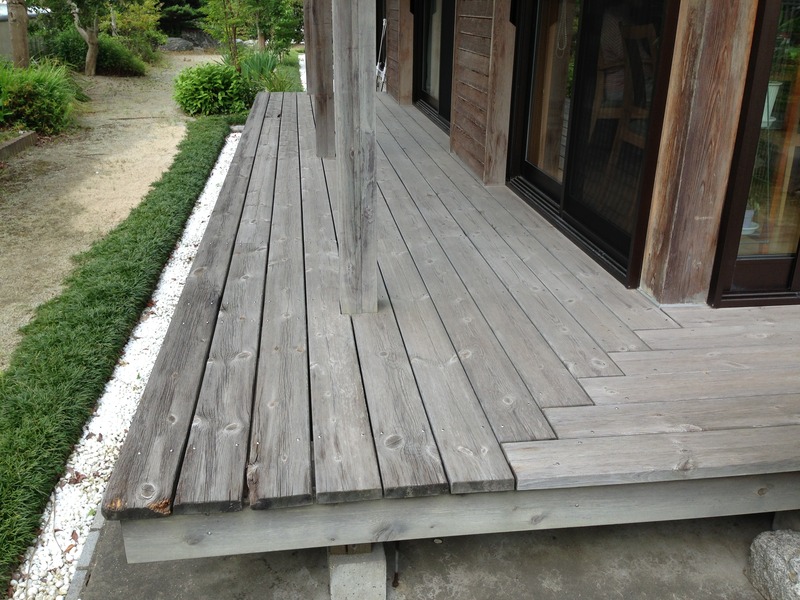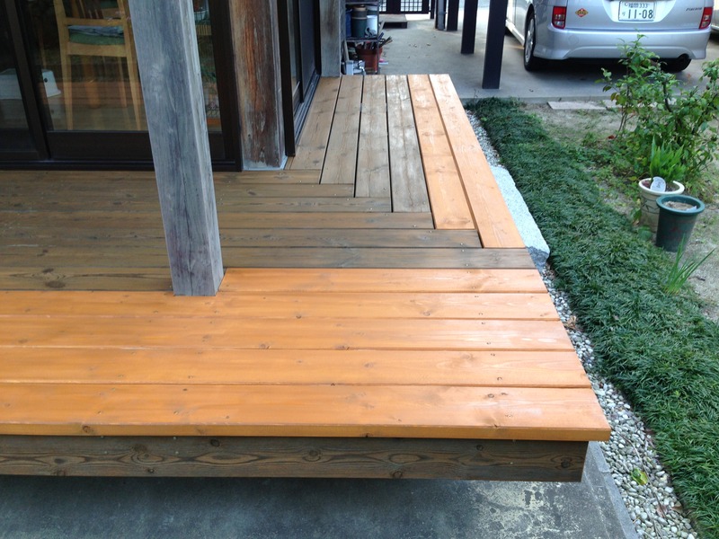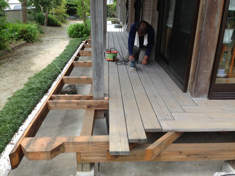 濡れ縁の天板を全て取替えるのではなく、痛んでいる天板のみを取り外し新しい天板に取替えました。痛んでいない既存の天板は、ペーパーヤスリで研磨して防腐剤のキシラデコールを塗装して仕上げました。