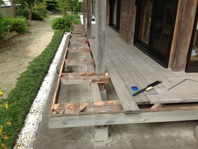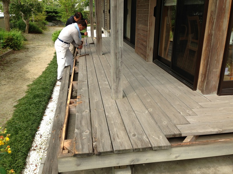 古くなって板が腐って穴が空いているので濡れ縁を修繕して欲しいと依頼があり打合せしていると全部張替えるのではなく悪くなっている部分のみを張替えをして欲しいとの要望がありましたので現場を調査して張替えが必要なところだけ張替えました。