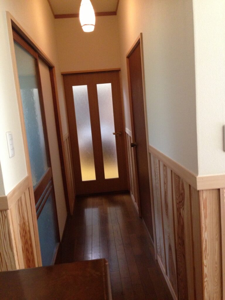 古くなった玄関ホールと廊下の壁と天井を明るい空間に仕上げました!ただクロスを貼るのではなく玄関ホールと廊下の壁に杉板の無垢板を貼り落ち着いた雰囲気のある玄関ホールと廊下に仕上げました!玄関を開けると杉板のいい香りがプ~ンと漂って来ます。