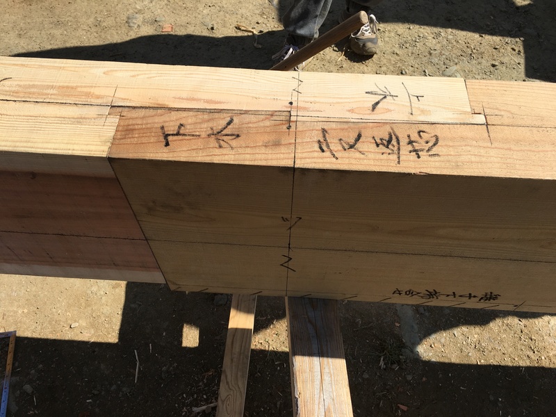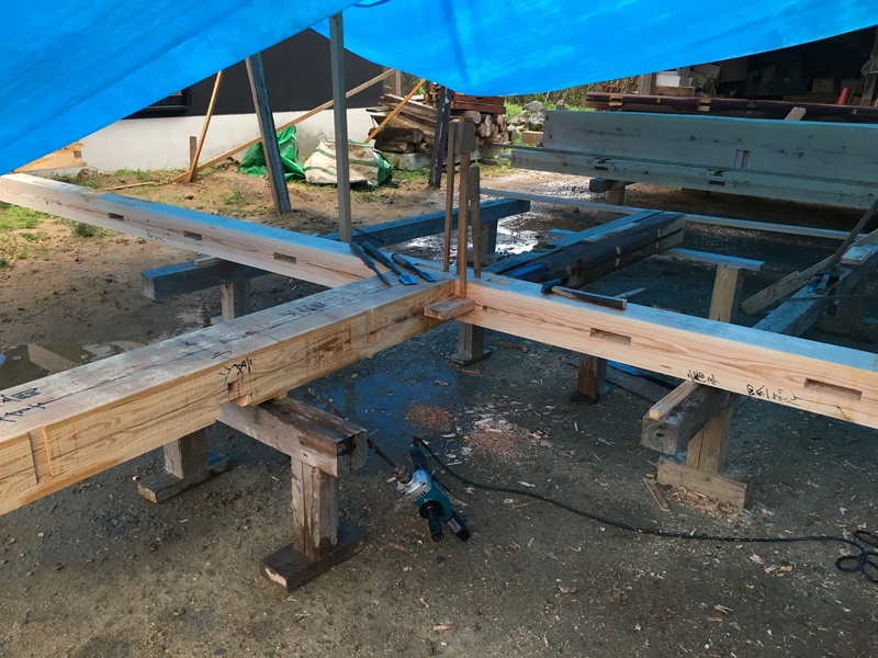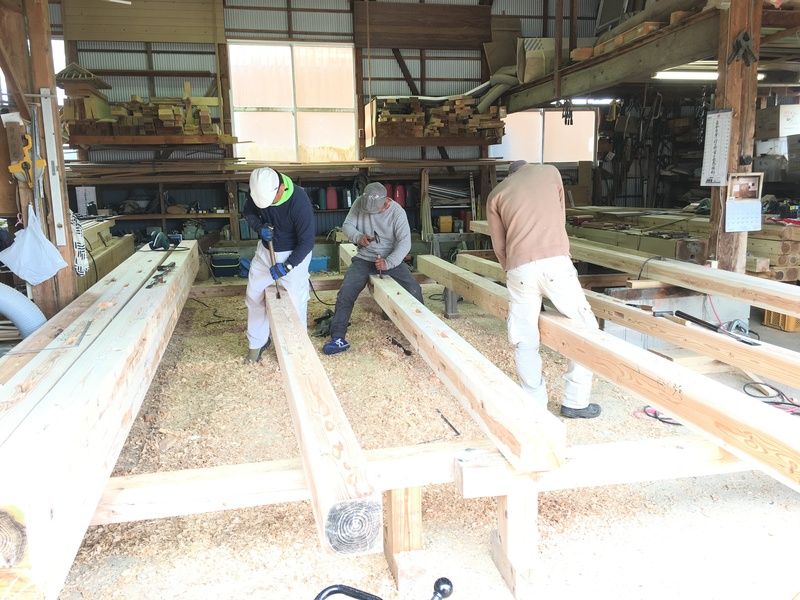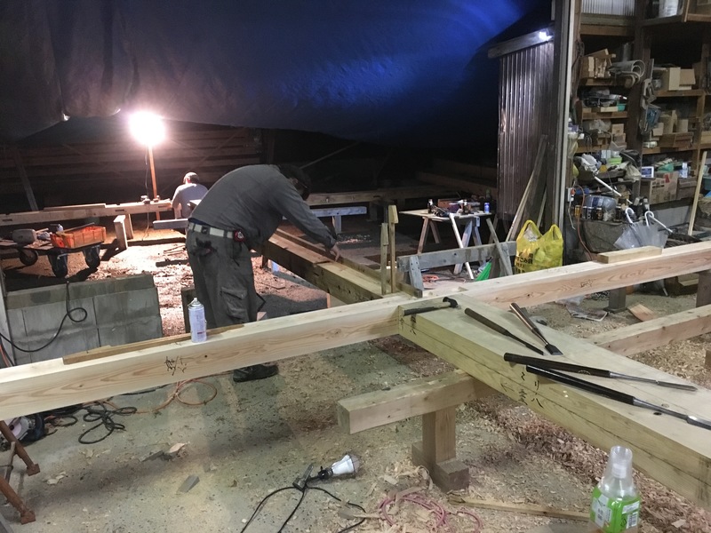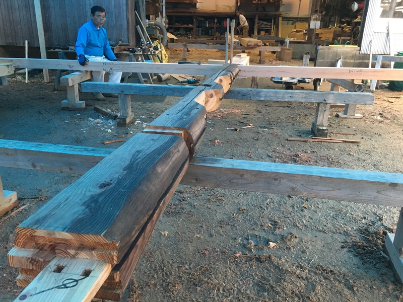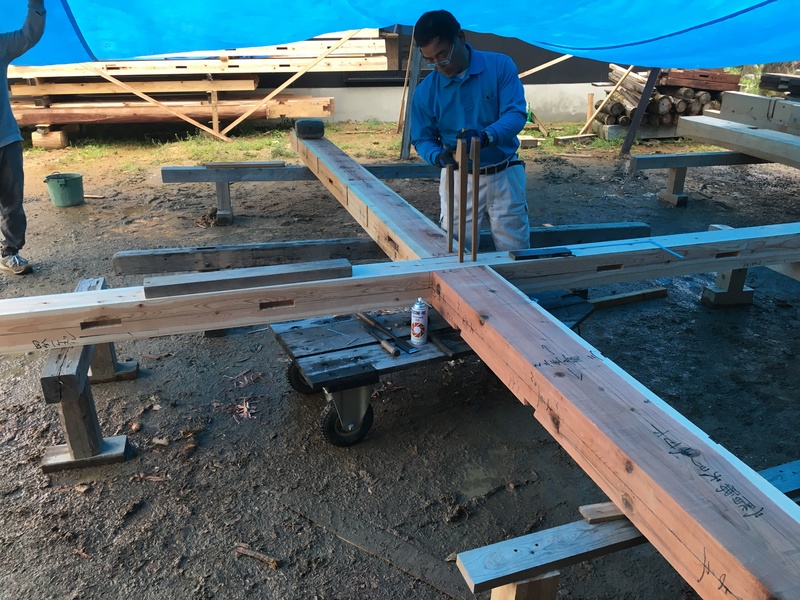 【熊本県 阿蘇市 古民家レストラン 阿蘇 はなびし】建築専門学校時代の友人の熊本地震復興古民家店舗再生工事 【通し柱手刻み、通し柱差し合わせ編】 (宗像市 白木建設)