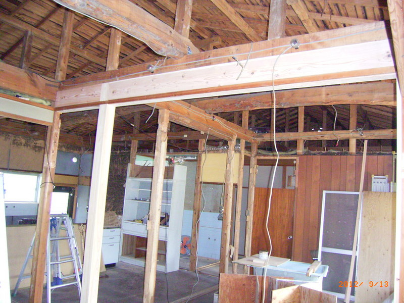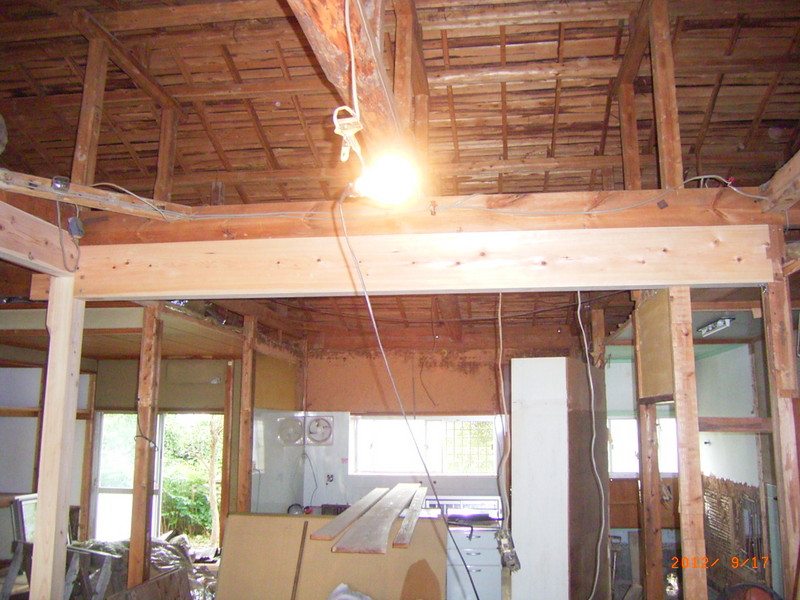 梁の補強工事です。座敷とリビングの壁を解体してガラス障子で仕切りを造るため柱を2本抜かなければなりません。そのために活躍するのが既存の梁の下に新しく入れた受梁です。昔ながらの木造住宅は近代の家よりいい材木で先人の職人さんがしっかり造りこんでいるのでこういう補強ができるのです。