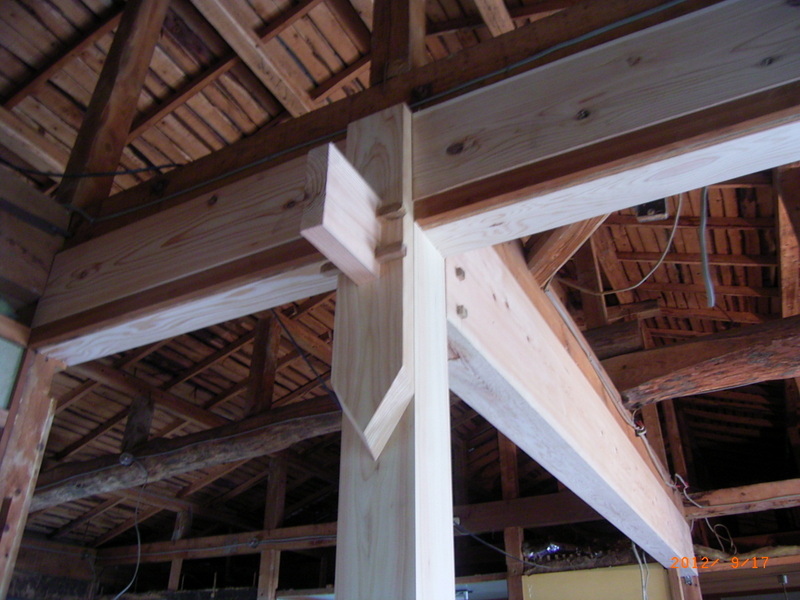 この工法が古代から受け継がれてきたホソ差し込み栓打ちです。このホソは家が出来上がっているためホソが入れられないため雇いホソといって受梁を納めた後に別の木材で雇ってきて(ホソを作って)ホソ差しをしています。