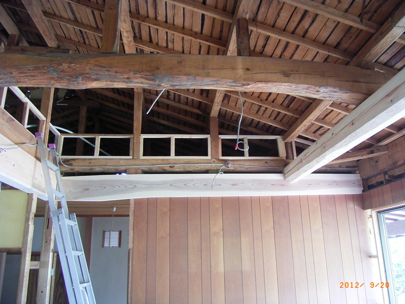 リビングに当初から見せようとしていた既存の太鼓梁ですが長年の乾燥収縮によりこの太鼓梁のアリが、かみ出しかけていました。そこで仮にこの梁がかみ出しても落ちないように下側に新たに敷梁を施しました。これもまた金物で補強するのではなく木造の家は全て木材で補強します。